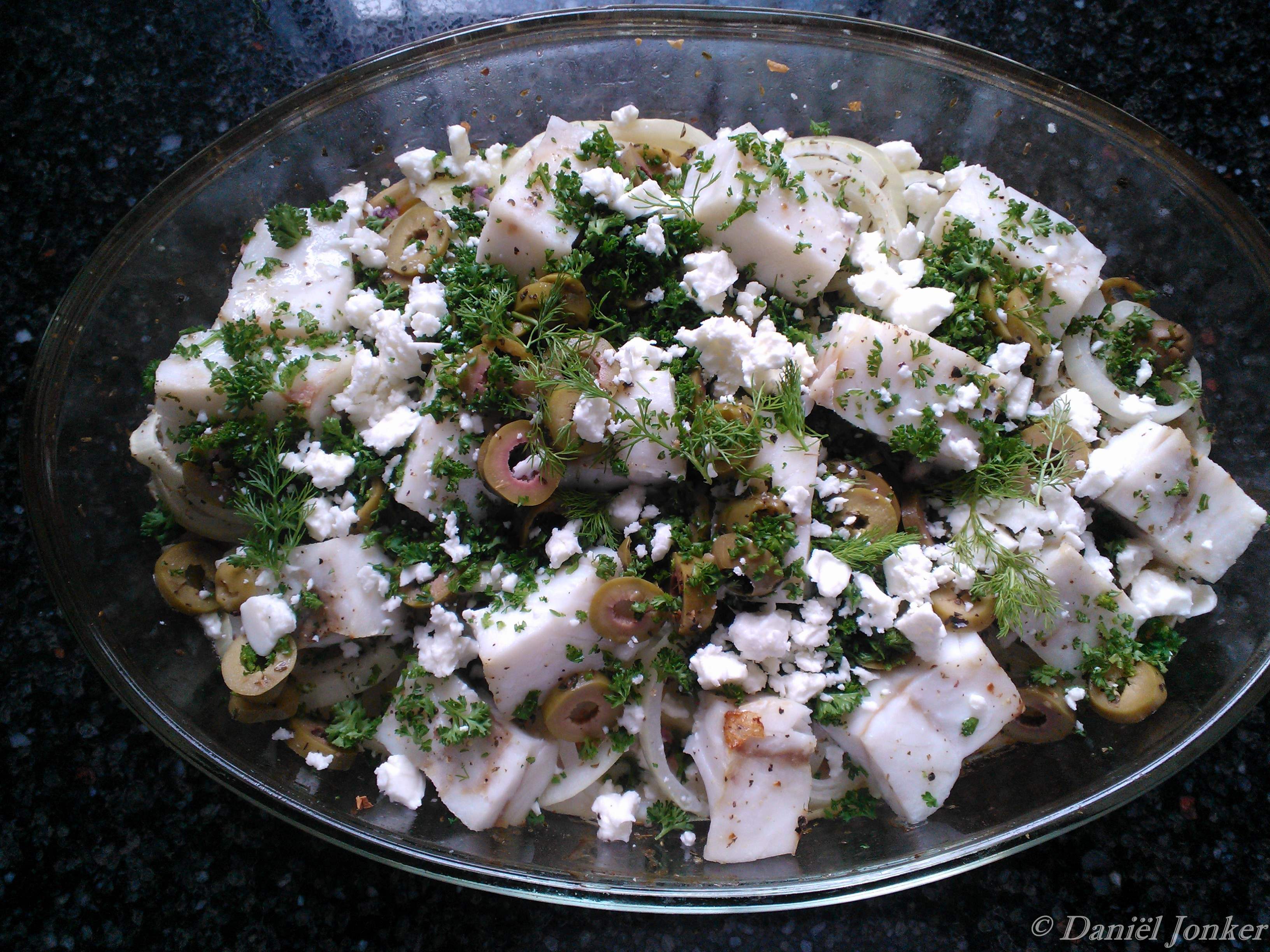 Aantal personen: 4 IngrediĆ«nten: 500 gr kabeljauw 4 grote rijpe tomaten 2 kleine venkels 2 klein uien 2 tenen knoflook 2 eetlepels verse oregano 1/2 bosje peterselie 3 eetlepels droge witte wijn 1 cm feta verkruimeld wat ontpitten olijven in plakjes 1 citroen in plakjes Hulpmiddelen: Keukenmes, snijplank en een ovenschaal Voorbereiding: Snij de venkel … Continue reading Psari plaki