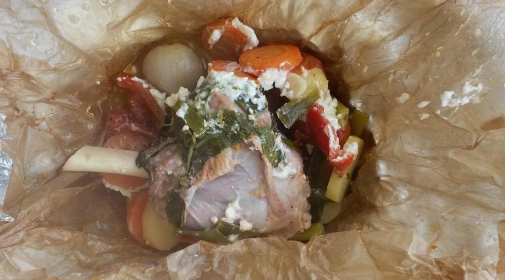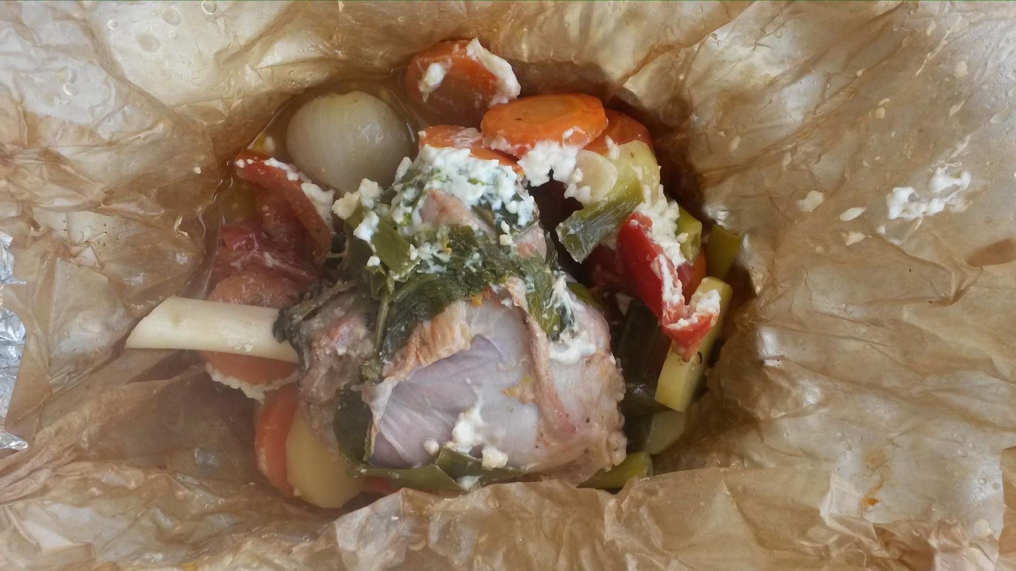 Maak per persoon een pakketje van aluminiumfolie en bakpapier doe daarin het mengsel van vlees en groenten. Verbrokkel er wat feta door en vermeng dit voorzichtig en vouw het dicht. Zo dat er geen stoom meer uit kan ontsnappen. Zet de pakketjes in de oven op 150 gr en laat het er 3 á 4 uurtjes in staan.